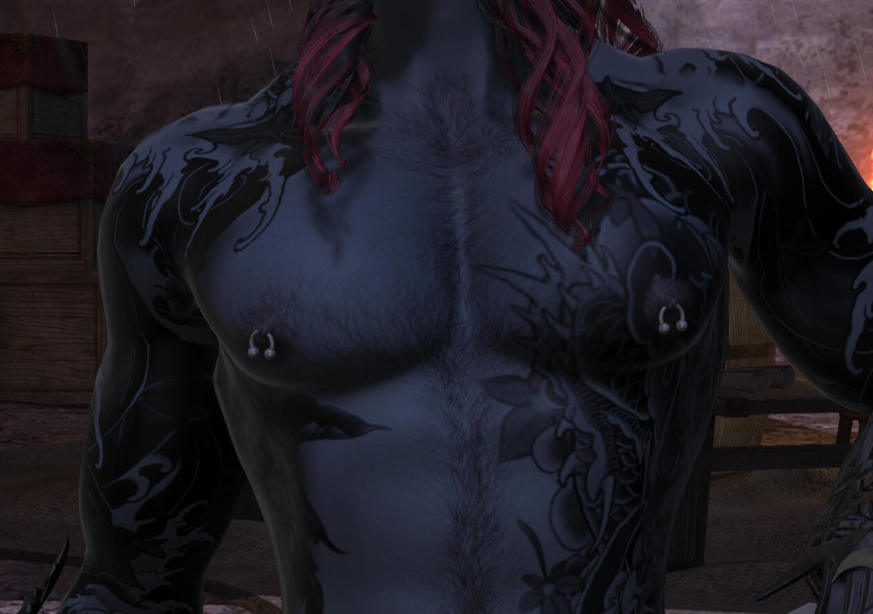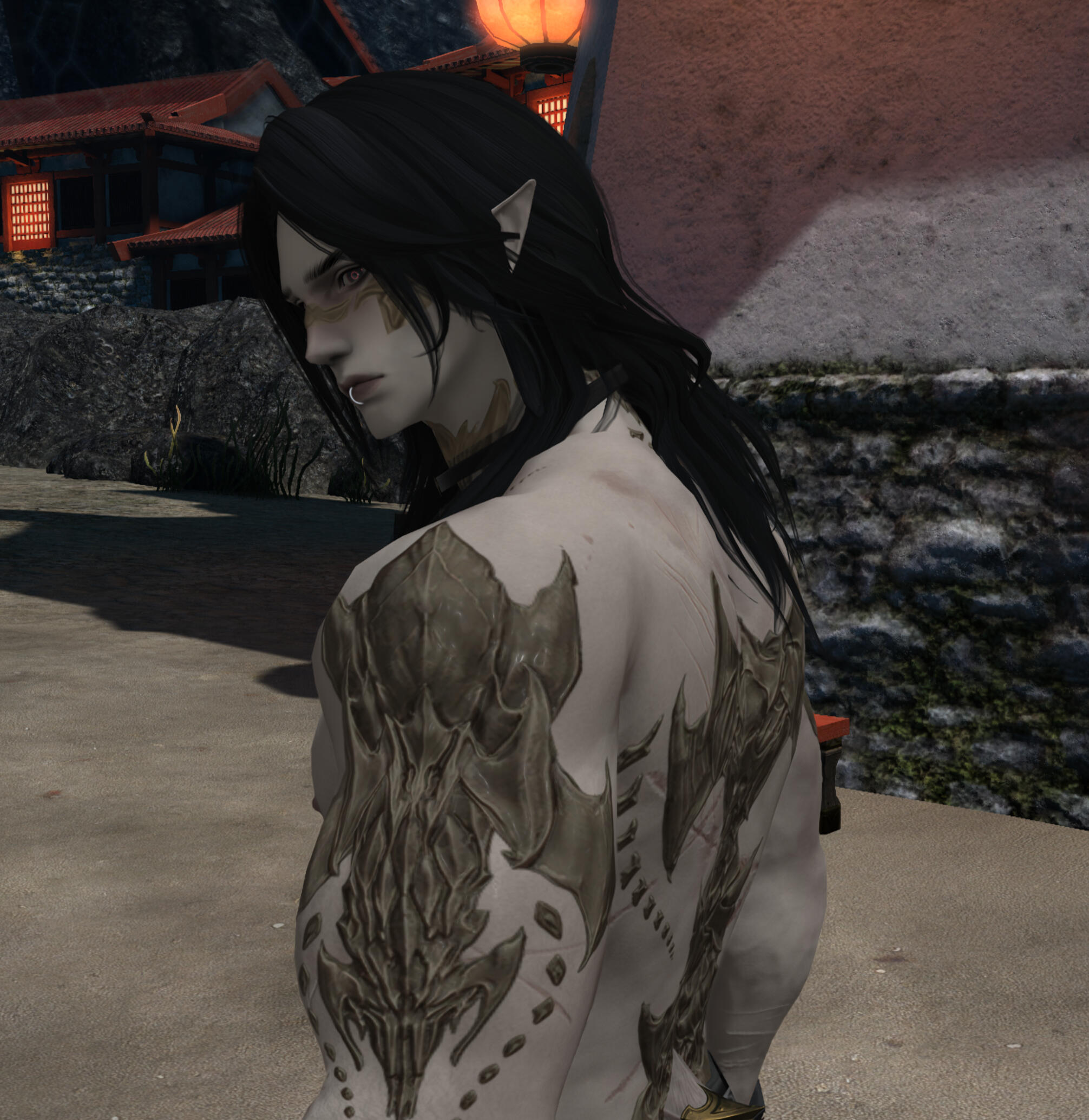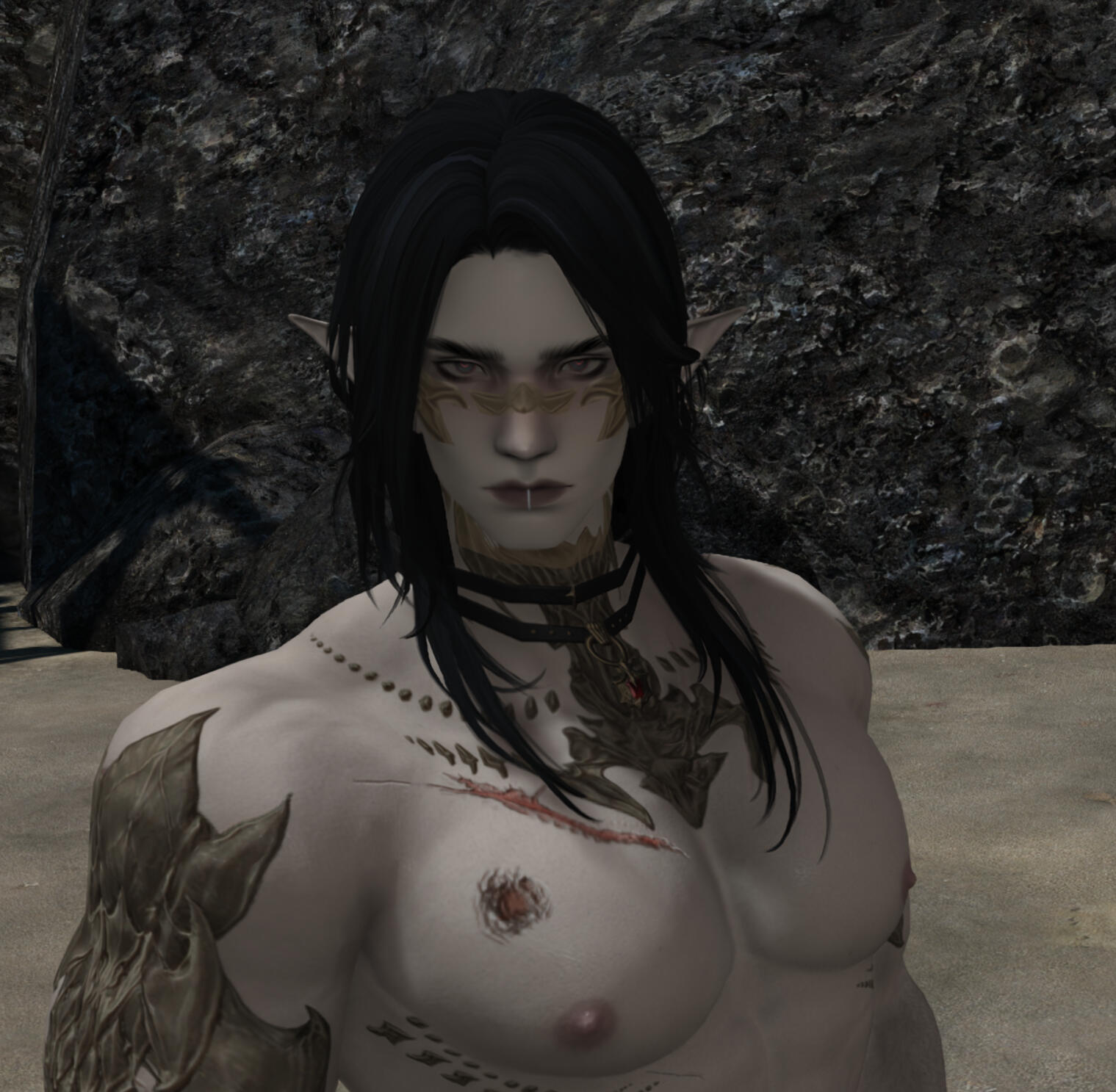 HEIGHT 7’4”HAIR jet blackEYES light greyPIERCINGS septum, penisSCARS / TATTOOS / MARKINGS tattoosVOICE Sebastian YorkPHYSICAL DESCRIPTION a very distinct Elezen face and ears, but with typical au ra golden scales and serrated tail; pale skinPOSITIVE TRAITS confident, charismatic if he wants to be, intelligentNEUTRAL TRAITS focused, drivenNEGATIVE TRAITS cold, ruthless, seemingly emotionlessDEITY Rhaelgr